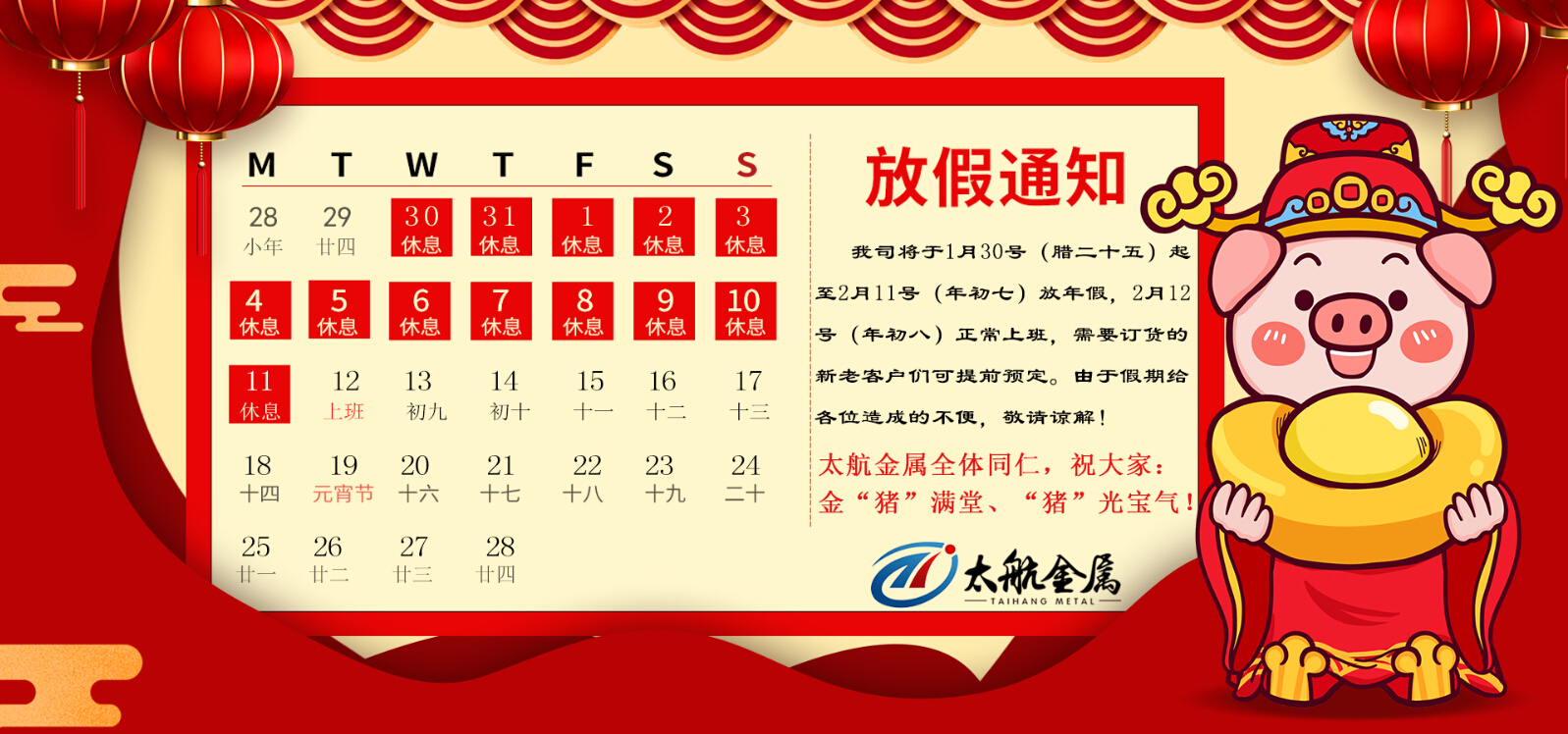 太航金屬全體同仁恭祝您及家人:新春快樂!財源廣進!“豬”諸事順利!闔家團圓!